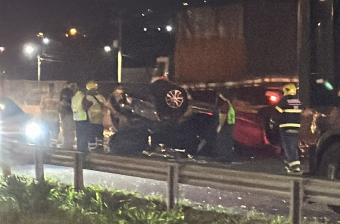 Além do carro capotado, o acidente envolveu outros quatro veículos. As duas faixas, que foram bloqueadas temporariamente, foram liberadas e os veículos foram removidos para o acostamento.