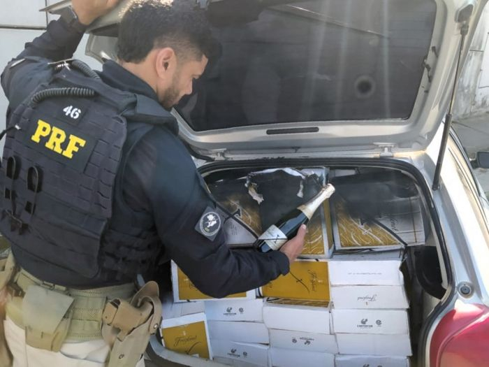 Policiais rodoviários federais apreenderam, no último sábado (16), 474 garrafas de espumante trazidos ilegalmente da Argentina. O motorista de um automóvel Gol, placas de São José do Cedro/SC, desobedeceu ordem de parada na BR-101, em São José, e fugiu em alta velocidade, quase atropelando alguns pedestres e batendo em outros veículos. Ele só parou depois de perder o controle do carro e colidir no canteiro na marginal da rodovia.