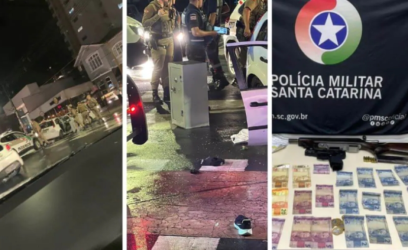Dentro do carro havia arma de fogo, facas, celulares, dinheiro, máquinas de cartão de crédito, relógio, corrente de ouro e um cofre, que aparece em uma fotografia no meio da rua na Alameda Rio Branco.