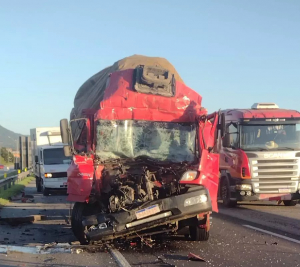 Dois caminhões colidiram, na manhã desta terça-feira (13), no km 217 da BR-101, em Palhoça. Segundo a concessionária Arteris Litoral Sul, que é responsável pelo trecho e está atendendo a ocorrência, há uma vítima fatal no local.