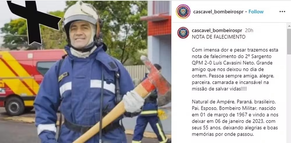 Ele estava aposentado da corporação há quatro anos. Em nota, os bombeiros de Cascavel lamentaram a morte do homem e destacaram a "pessoa amiga, alegre e parceira" que era Neto.