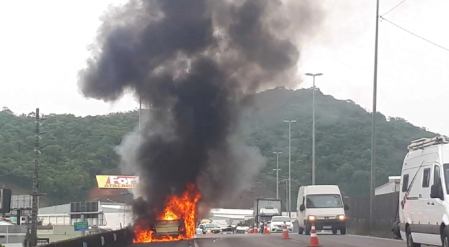 Um caminhão pegou fogo na BR-101, em Balneário Camboriú, no Litoral Norte catarinense, e deixou o trânsito lento na manhã desta quarta-feira (28). O motorista desceu do veículo segundos antes da explosão acontecer, contou o homem. A empresa responsável pela manutenção da rodovia foi ao local por volta das 10h. Foi necessário interditar totalmente as pistas para o combate às chamas.