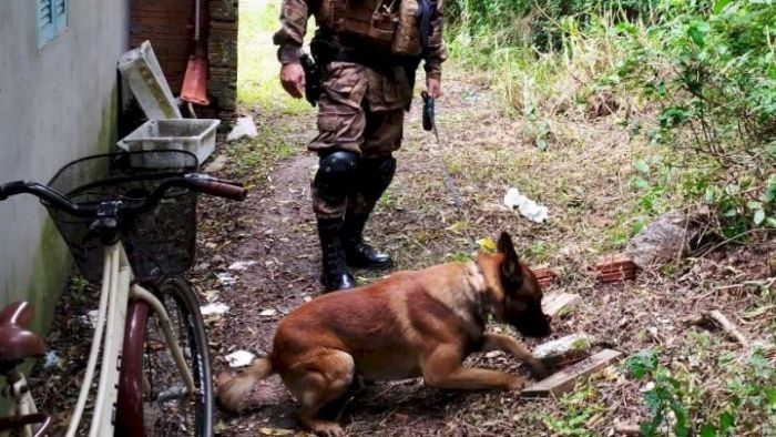 Ao checar a informação, não foi possível flagrar o tráfico, porém o cão farejador da PM, o K9 GAM farejou em uma moita um pacote escondido.