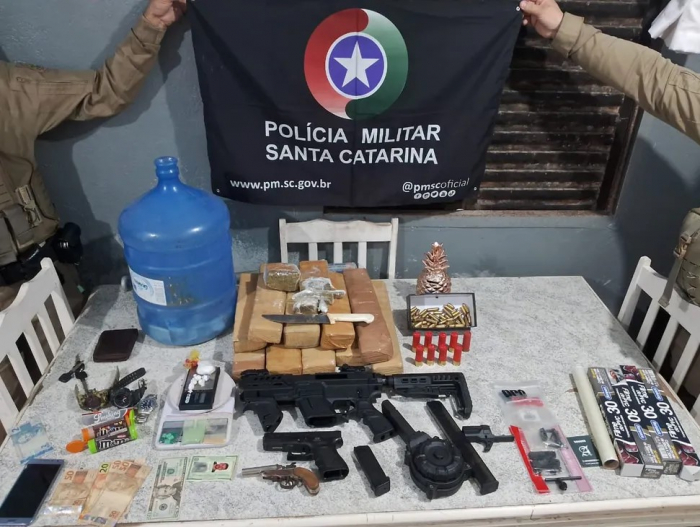 Na revista do carro que estava aberto, os policiais acharam uma pochete com maconha, algumas porções de cocaína e R$ 500. Já dentro da casa foram localizados outras drogas, uma pistola, kit de arma, munições de diversos calibres e outros objetos.