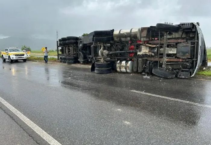 Uma carreta tombou na Rodovia Ivane Fretta, nesta terça-feira (31), em Tubarão. O condutor do veículo teve fratura no braço e foi levado ao Hospital Nossa Senhora da Conceição.