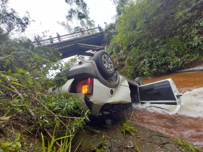 Um motorista de 38 anos precisou ser socorrido de helicóptero após o carro que ele conduzia caiu de uma ponte de aproximadamente 30 metros de altura, em Lauro Müller.