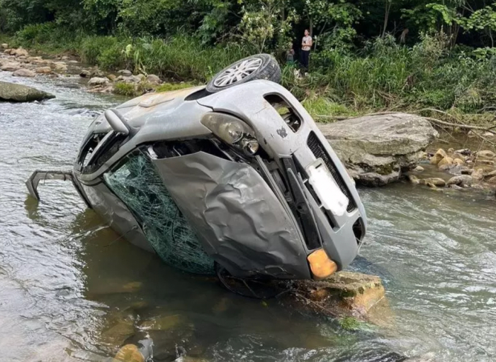 Foto: CBM Uma família sobreviveu nesta terça-feira (23) a um capotamento na BR-282, em Alfredo Wagner, na Grande Florianópolis, em Santa Catarina. O veículo, que levava três pessoas, girou na rodovia, saiu da pista e despencou de uma altura de 10 metros em um rio. Todos sofreram ferimentos leves e passam bem, segundo o Corpo de Bombeiros.