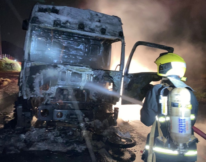 Ao chegar no local, a guarnição se deparou com a cabine do caminhão já totalmente tomada pelas chamas, com uma vítima embaixo da roda dianteira esquerda e uma motocicleta embaixo do caminhão.