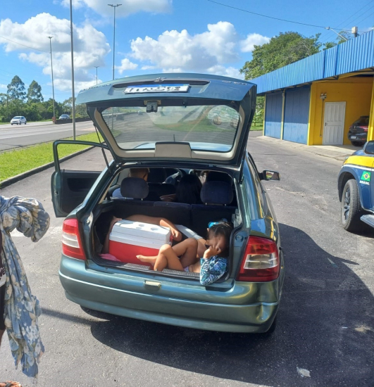 Policiais rodoviários federais flagraram neste domingo (5), um homem que transportava seus dois filhos no porta-malas de um automóvel. A ação ocorreu na BR-101 em Paulo Lopes.