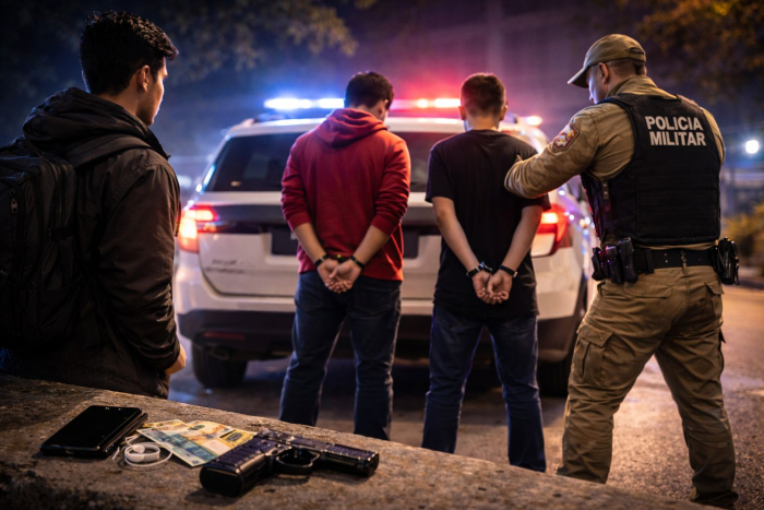 Segundo relato, os criminosos anunciaram o assalto e ameaçaram atirar caso o jovem não entregasse seus pertences. Sob forte tensão, ele acabou entregando celular, dinheiro, fone de ouvido e relógio. Após a ação, a vítima conseguiu pedir ajuda, o que levou a Polícia Militar a iniciar rapidamente um cerco na região.