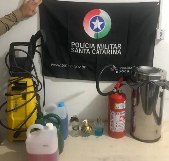 Conforme a PM, os moradores do prédio ouviram um estouro e flagraram dois homens arrombando o portão. A dupla furtou do edifício um lava jato, um extintor de incêndio, uma lata de lixo e produtos de limpeza.