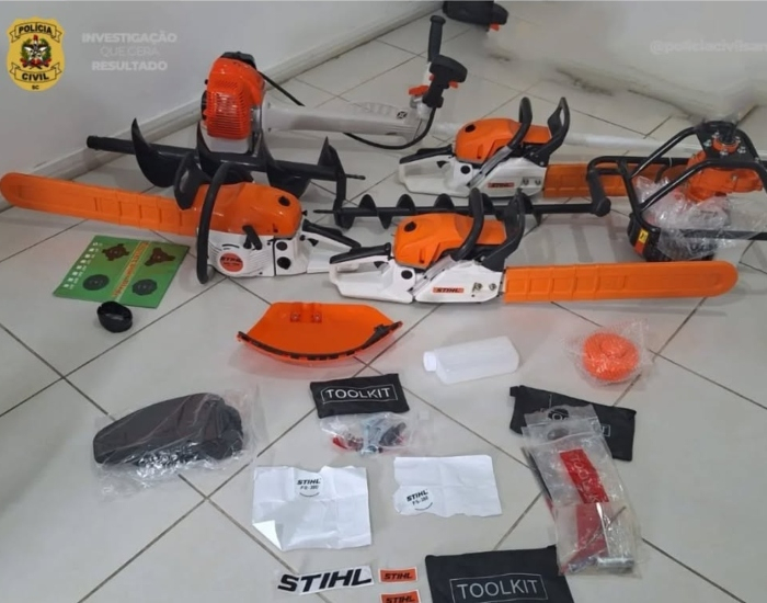 As ferramentas foram apreendidas, e constatou-se que eram de baixa qualidade. Durante buscas no veículo, com placas do Rio Grande do Sul, foi descoberto que os suspeitos utilizavam adesivos com a inscrição "Stihl" para adulterar ferramentas de menor valor e qualidade, posteriormente comercializadas como se fossem da marca renomada. Outras ferramentas adulteradas também foram encontradas no automóvel. Diante dos fatos, os dois indivíduos foram conduzidos à Central de Plantão Policial de Laguna, onde foram autuados por tentativa de estelionato contra idoso.