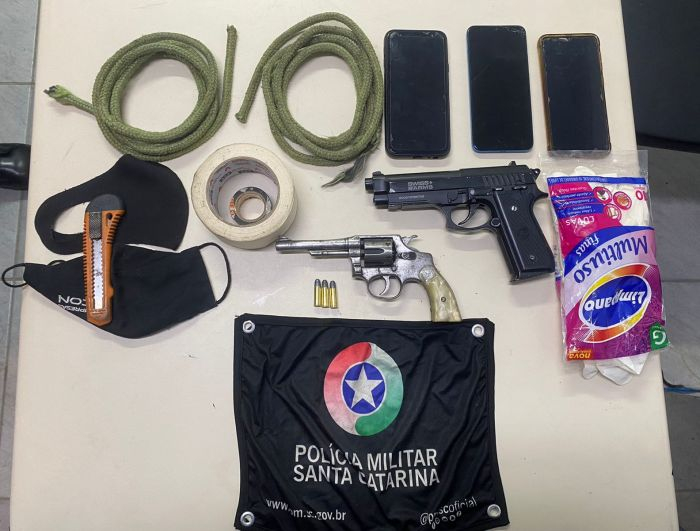 No banco traseiro, foram localizadas duas mochilas, sendo que uma delas continha no seu interior: dois pedaços de corda, dois rolos de fita e um estilete. Na outra mochila havia um pacote de luvas descartáveis e duas máscaras. Segundo a PM, todo esse material apreendido é tipicamente utilizado para amarrar e amordaçar vítimas de assaltos em residências.