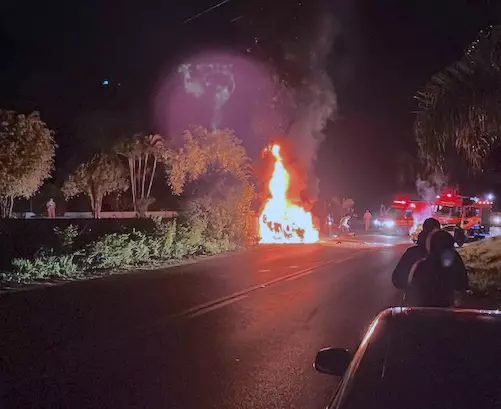 Dois carros bateram de frente, e com o impacto, um deles capotou e pegou fogo. Corpo de Bombeiros, Samu, Polícia Militar Rodoviária e Polícia Militar atenderam o acidente.