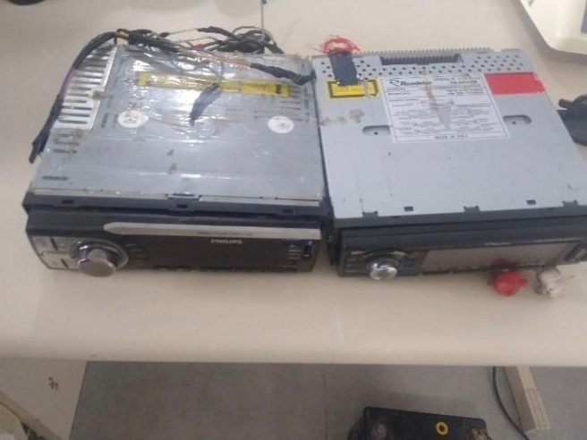 O funcionário informou que avistou alguns veículos com as portas abertas, e ao verificar as câmeras de vigilância conseguiu observar o homem abordado dentro do pátio da empresa. O suspeito foi abordado do lado de fora da empresa de posse de dois aparelhos de som automotivos, dois óculos de sol, uma bolsa feminina e uma bateria veicular.