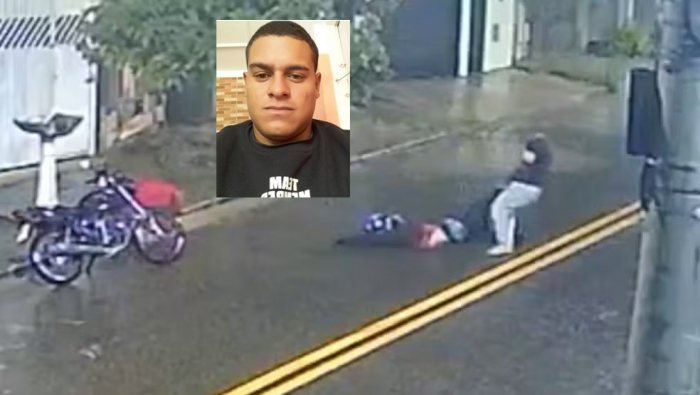Câmera de monitoramento registrou o crime. Após disparar contra a vítima, suspeito arrastou o corpo do motoboy para o outro lado da rua.