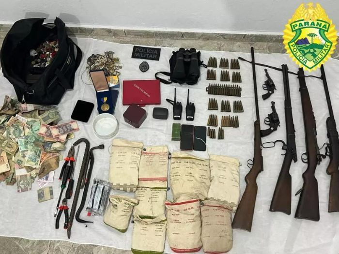 A operação resultou na apreensão de duas armas de fogo, munições de vários calibres, joias, moedas antigas e equipamentos de comunicação. A PM segue nas buscas pelos demais suspeitos, que não foram localizados após o cerco policial.