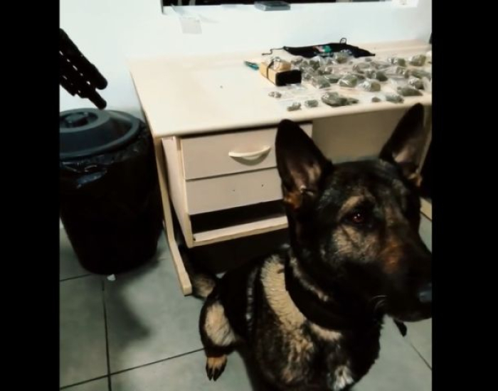 Com o apoio do cão policial Diamante, os agentes realizaram buscas na residência, onde localizaram aproximadamente 950 gramas de maconha, além de materiais utilizados para o embalo da droga.