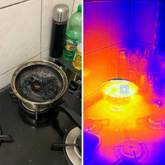 O ambiente estava tomado pela fumaça, a qual vinha de uma panela que estava esquecida sobre o fogão ligado.