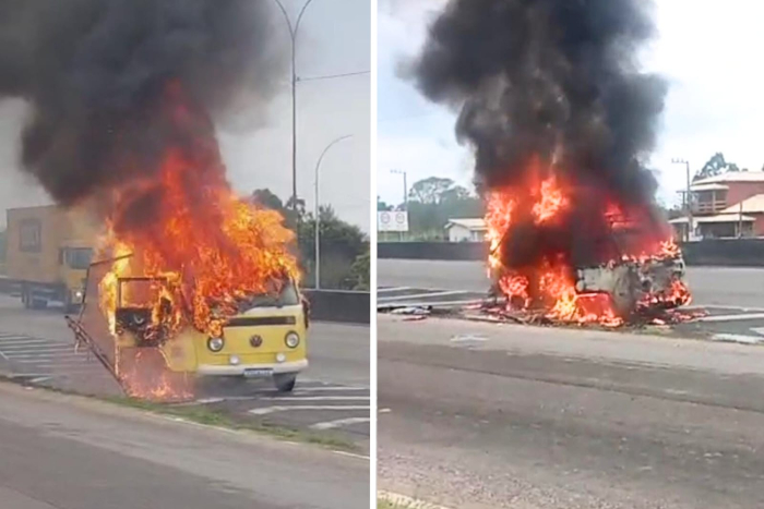 Foto: Portal Ahora Um incêndio registrado no fim da manhã desta terça-feira (9) destruiu por completo uma kombi que trafegava pela BR-101, em Imbituba, na altura do bairro Guaiúba.