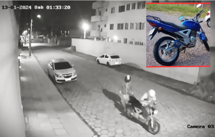 Na madrugada deste sábado (13), por volta da 1h30, no bairro Dehon, em Tubarão dois homens foram flagrados praticando o furto de uma moto Honda CB Twister, de cor azul. A dupla de ladrões fugiu empurrando o veículo, conforme mostrou uma câmera de monitoramento nas proximidades.