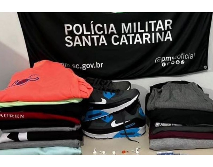 Foto: Divulgação / PM Um jovem de 27 anos foi preso por volta das 19h10 dessa quinta-feira, dia 21, no bairro Caputera, em Laguna, após a Polícia Militar (PM) encontrar em sua casa drogas e roupas furtadas. Segundo a PM, foram apreendidos na residência 17 petecas de cocaína, uma porção de maconha, R$ 111 em dinheiro, três celulares e peças de roupas furtadas de uma loja da região.