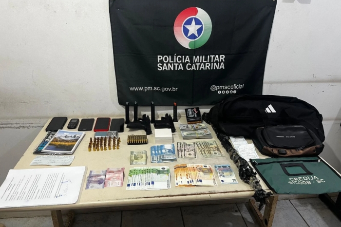 Mais de R$ 150 mil em dólares, euros e pesos foram apreendidos durante uma ocorrência na tarde desse sábado (11), em Araranguá. Quatro homens, de 18, 21, 34 e 40 anos, foram presos pela Polícia Militar (PM), por volta das 16h, sob suspeita de praticarem furtos no município.