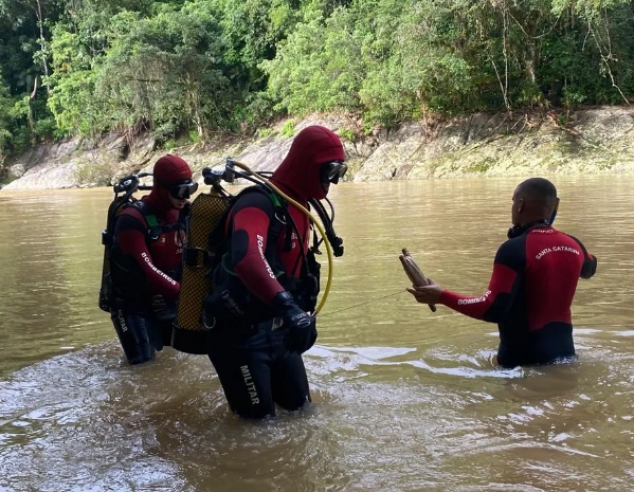 As buscas foram suspensas no início da noite de sábado e retomadas na manhã deste domingo (5). Os mergulhadores seguem na procura dentro da água.