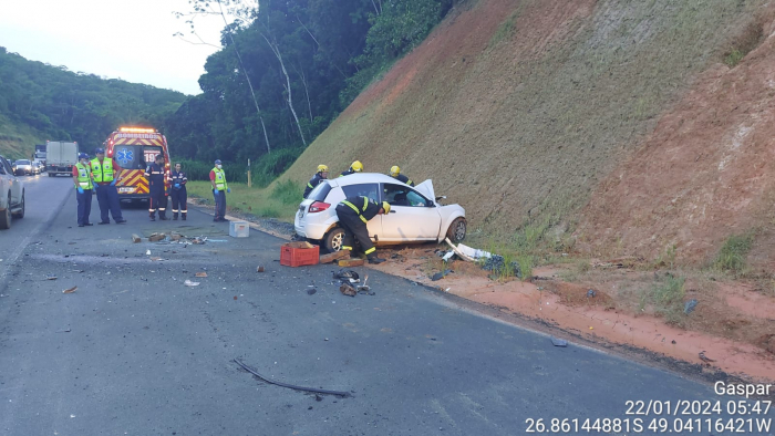 Acidente aconteceu na região da Fortaleza, perto de Gaspar. Foto: CBMSC Um acidente na BR-470 em Blumenau matou o motorista de um carro no começo da manhã desta segunda-feira (22). O veículo bateu de frente com uma carreta, que chegou a tombar às margens da rodovia por conta da colisão. O trânsito foi interrompido e filas enormes se formaram em ambos os sentidos.