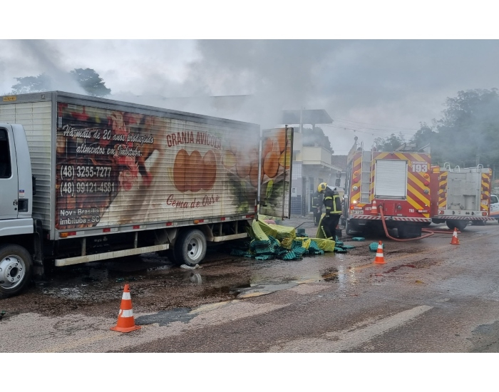 O Corpo de Bombeiros foi acionado e combateu o fogo no veículo carregado com bandejas para ovos nesta segunda-feira