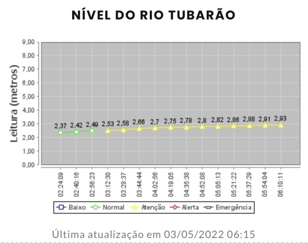 Com as fortes chuvas na região, o nível do Rio Tubarão aumenta gradativamente. De acordo com a Plantar Agronomia, as 06h15 desta terça-feira, o rio atingia 2,93m. A medida está dentro da faixa de segurança, levando em consideração que o estado de alerta começa a partir dos 05m.