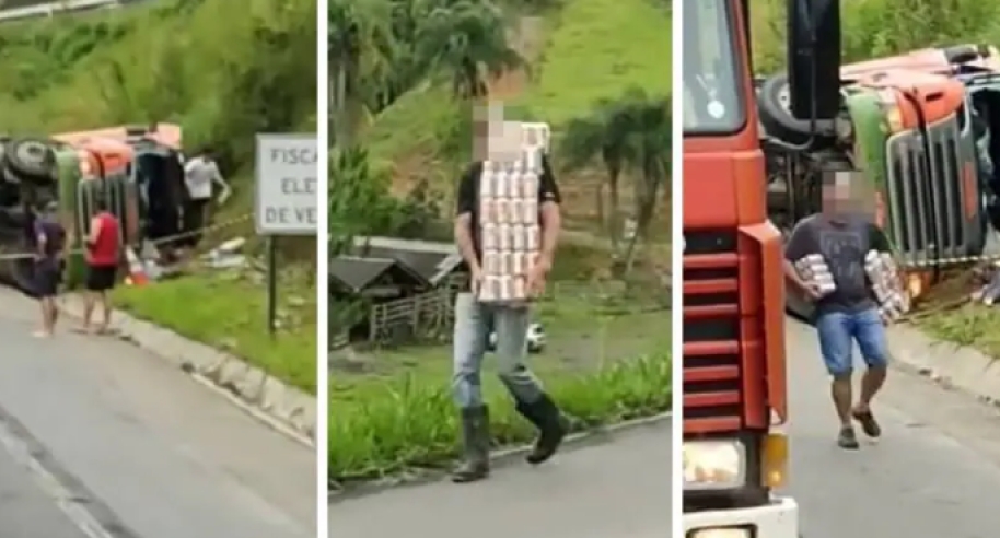 O caminhoneiro Valdomiro Abreu ficou preso no bloqueio da rodovia quase de frente à cena do acidente, registrado por volta das 9h desta terça-feira (27). Ele fez uma série de vídeos onde homens também aparecem levando cerveja embora. Alguns chegam a olhar para os lados, como se estivessem preocupados em serem flagrados. Um deles chega a andar pelo acostamento com seis caixas nos braços.
