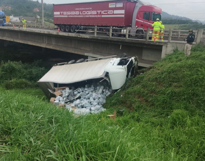 O motorista de um caminhão perdeu o controle do veículo após sair da pista, um pneu furar e tombar próximo a um córrego às margens da BR-101, n bairro São Cristóvão, em Tubarão. O acidente ocorreu nesta quarta-feira (27). A Polícia Rodoviária Federal (PRF) esteve no local e controlou o trânsito que ficou congestionado.