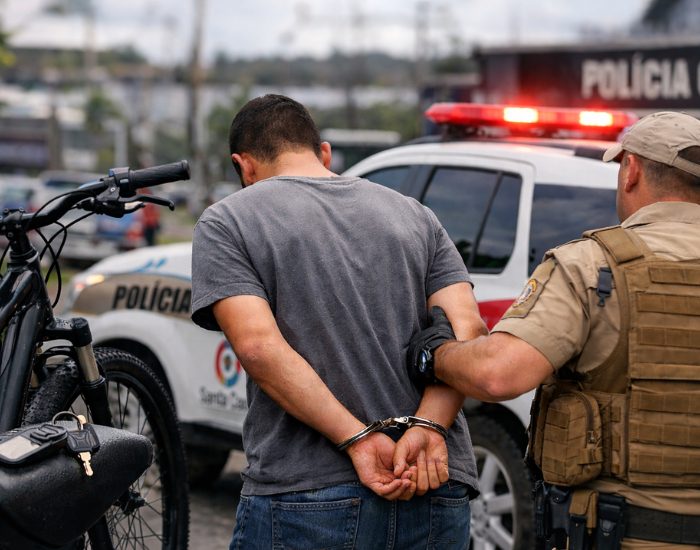 Diante da situação, o homem recebeu voz de prisão no local e foi encaminhado à Delegacia de Polícia Civil, juntamente com a bicicleta recuperada. As autoridades adotaram os procedimentos legais cabíveis, e o caso segue sob investigação.