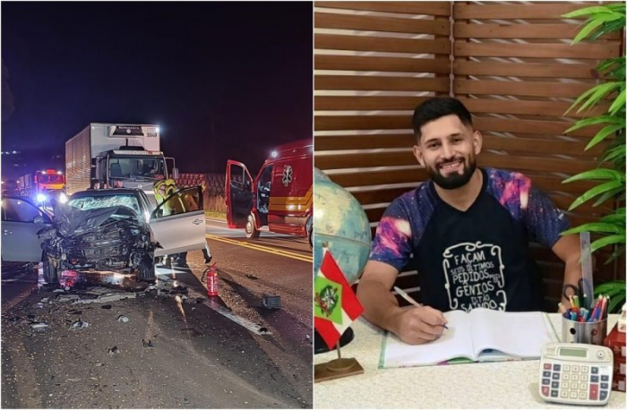 O professor de matemática morreu após se envolver em um grave acidente de trânsito na noite do sábado (16). – Foto: Montagem/Corpo de Bombeiros/Arquivo Pessoal/ND Um grave acidente de trânsito terminou com a morte do professor de matemática Alisson Luiz Morais, de 28 anos. A colisão aconteceu por volta das 21h do sábado (16) e envolveu um carro e um caminhão na BR-282, em Xaxim, no Oeste de Santa Catarina.