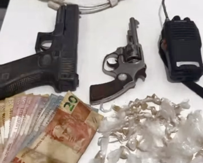 Dentro, havia um revólver calibre 22, um simulacro de pistola e um tubo com sete porções de cocaína. Na residência, foi encontrado mais um tubo com 49 porções de crack prontas para venda e um rádio comunicador.