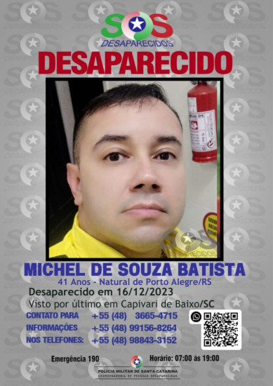 Michel de Souza Batista tem 41 anos. Ele saiu para trabalhar por volta das 2h. Ele é vigilante em uma empresa às margens da BR-101, em Capivari. A família acredita se tratar de um sequestro, pois ao acionar as autoridades policiais, o seu carro foi visto trafegando pela Rodovia Federal, sentido Laguna, com duas pessoas no banco traseiro do veículo.