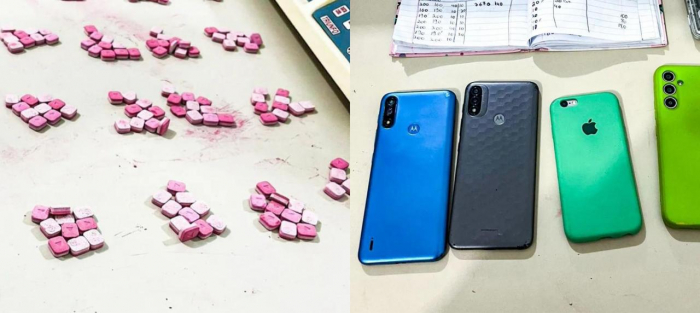 O suspeito, juntamente com outro homem, tentaram fugir ao perceberem a presença da PM, mas foram detidos. Na residência foram encontrados 484 comprimidos de ecstasy, balança de precisão, caderno de anotações do tráfico e quatro celulares.