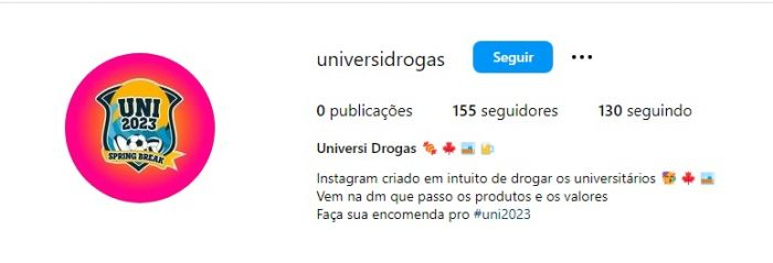 Na descrição do perfil, com o nome "Universidrogas", o traficante diz: "Instagram criado em intuito de drogar os universitários. Vem na dm que passo os produtos e os valores. Faça sua encomenda pro #uni2023", finaliza a descrição do perfil.