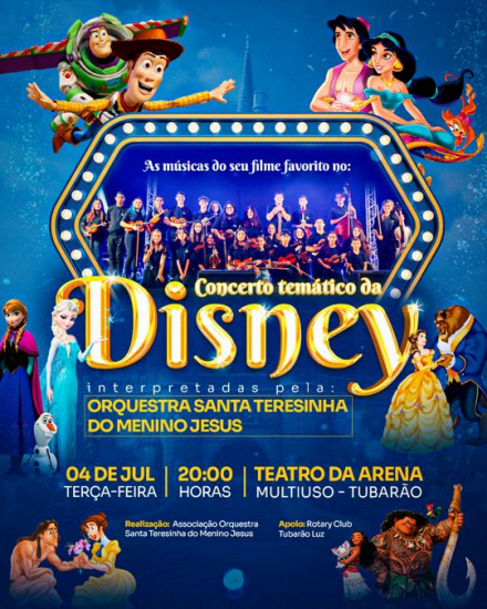 Já imaginou ouvir as trilhas sonoras das animações da Disney tocadas por uma Orquestra? A Orquestra Santa Teresinha do Menino Jesus coloca isso em prática nesta terça-feira, dia 04 de Julho, a partir das 20 horas no Teatro da Arena Multiuso. As mais belas canções serão apresentadas pelas crianças e adolescentes que fazem parte do projeto social. O concerto tem uma duração aproximada de uma hora e meia e é organizado pela Associação da Orquestra e Rotary Club Tubarão Luz.