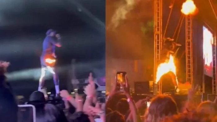 A roupa do rapper mineiro Djonga pegou fogo neste domingo (19), durante show que ele fazia em Cabo Frio, no Rio de Janeiro. Um dos efeitos pirotécnicos acabou saindo errado, e a bermuda do artista ficou em chamas. Ele precisou tirar a peça no palco, ficando de cueca. O rapper passa bem.