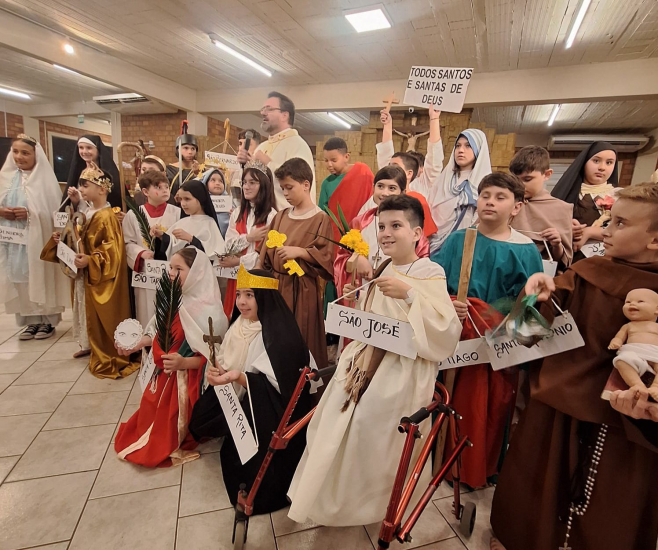 As crianças, vestidas de santos e anjos, participaram da Santa Missa, e ficaram aos pés do altar, representando a Igreja triunfante que reza conosco. De acordo com o pároco, Pe. Edison de Souza Müller, a atividade é para incentivar as crianças a se vestirem de pessoas que demonstram a santidade, ao contrário do Halloween.