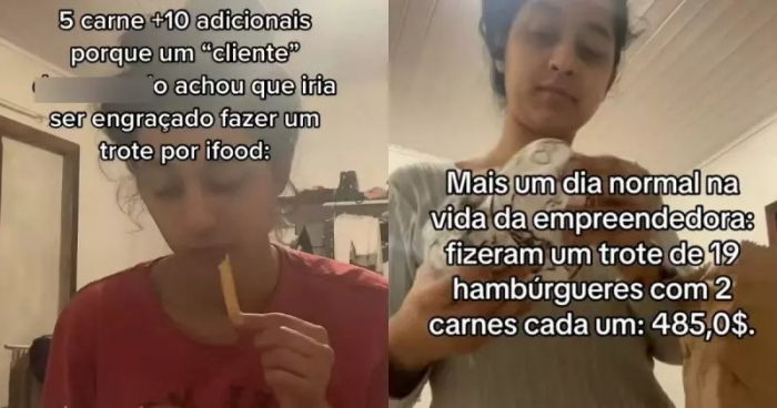 Em um vídeo publicado no TikTok, Maytê Felisberto expôs a situação. “Fizeram um trote de 19 hambúrgueres com duas carnes no valor de R$ 485”, disse a jovem.