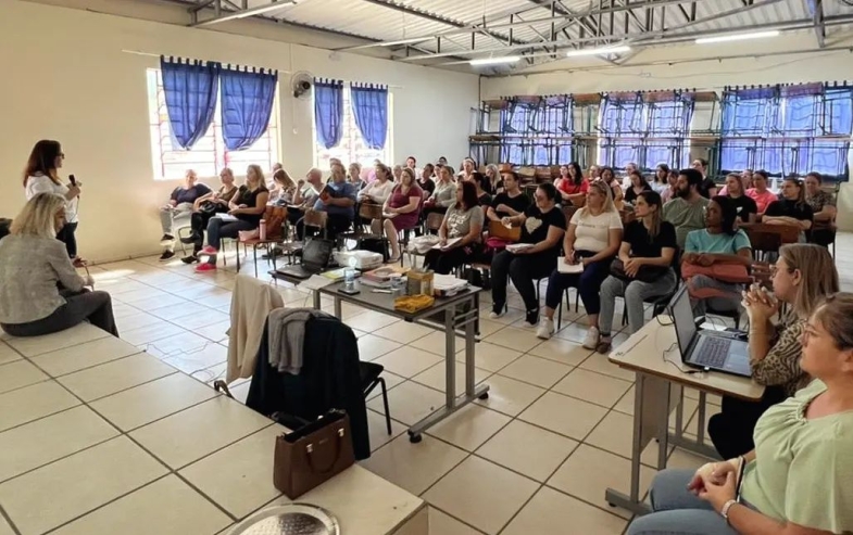 No primeiro dia, as educadoras Clésia da Silva Mendes e Rosandra Sachetti Hubbe falaram aos docentes sobre a comunicação como uma habilidade essencial para criar conexões no contexto pedagógico na Escola Geraldina Tavares.